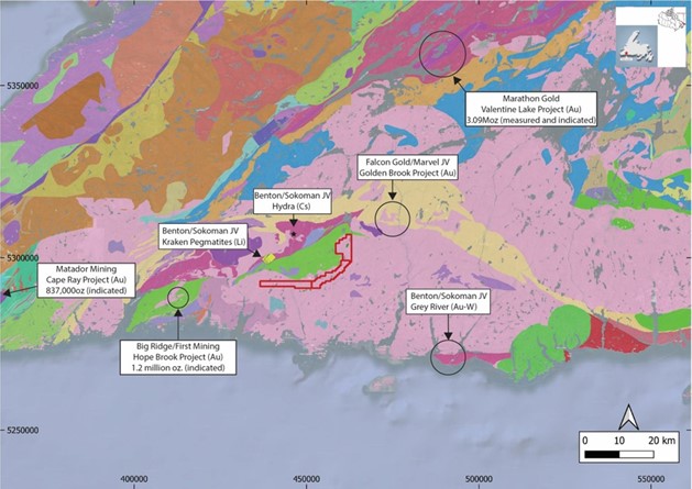 The Big Hill Lithium property consists of three contiguous exploration licences consisting of 100 claims each for a total of 300 claims covering 7,500 hectares. The property lies adjacent to the Kraken Lithium and the Hydra cesium discoveries. The three licenses were map staked for potential spodumene-bearing pegmatites based on a compilation of geological map information in the area and on their proximity to the high-grade, spodumene-bearing, Kraken lithium discovery by the Sokoman Minerals – Benton Resources Alliance in 2021, and the subsequent discovery of high-grade cesium in pegmatite from the Hydra Zone.