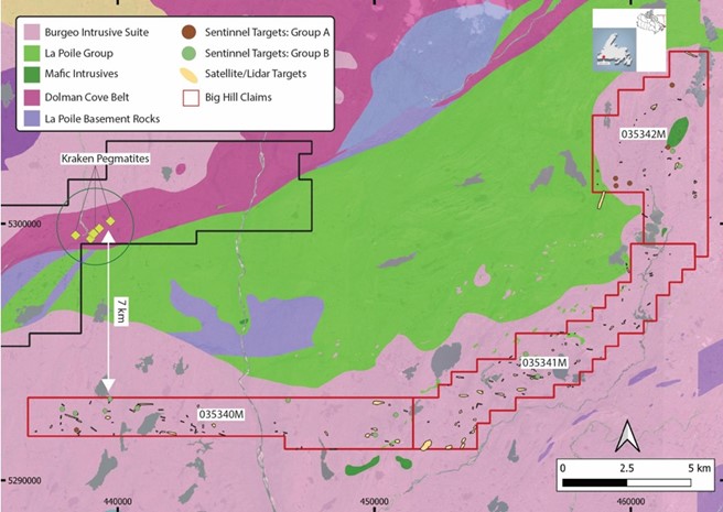 Figure 2: Big Hill property showing the location of the Kraken lithium-bearing pegmatites with exploration targets.