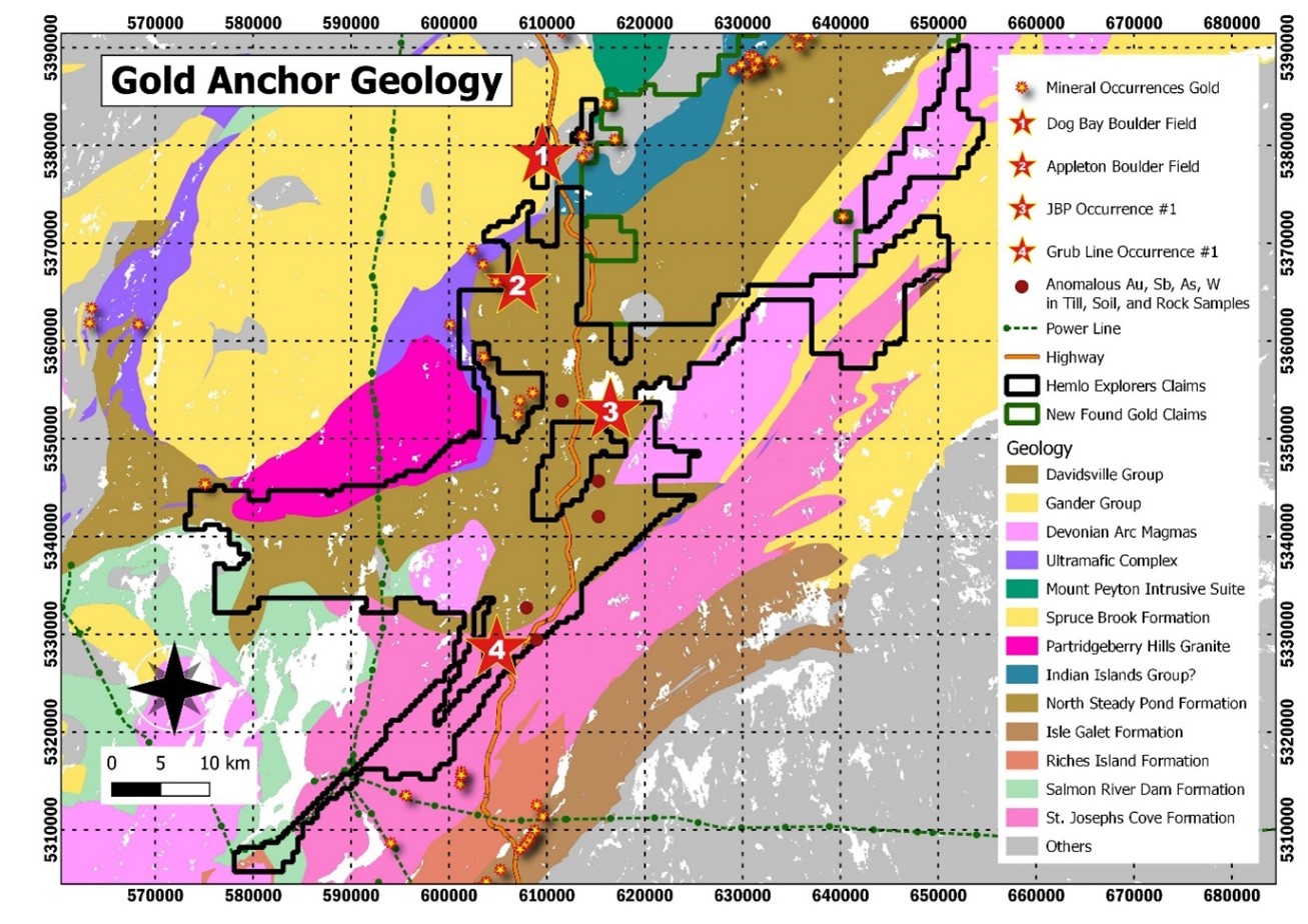 TORONTO, Jan. 15, 2025 (GLOBE NEWSWIRE) — Hemlo Explorers Inc. (the “Company” or “Hemlo”) (CSE: HMLO) is pleased to announce that it has discovered in-situ visible gold, visible gold in a boulder, multiple priority gold targets, the southwest continuation of the Appleton and JBP gold bearing fault corridors and large unexplored fault corridors within the Gold Anchor Project in central Newfoundland (see Map 1 and Map 2 below).
