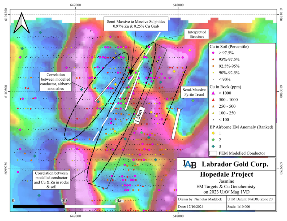 Figure 3. Cu-Zn Geochemistry and EM conductors in the Jasmine area.