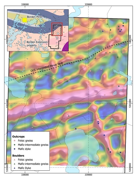 The magnetic survey identified a major east-northeast trending lineament in the central part of the survey area which is underlain by quartz-biotite gneiss in two locations (Figure 4). An increase in the magnetic intensity approximately 500m north of this lineament corresponds with outcrops of mafic gneiss and amphibolite which correlates well with an Ontario Geological Survey interpreted north-dipping thrust fault in the area (OGS map P.3821).