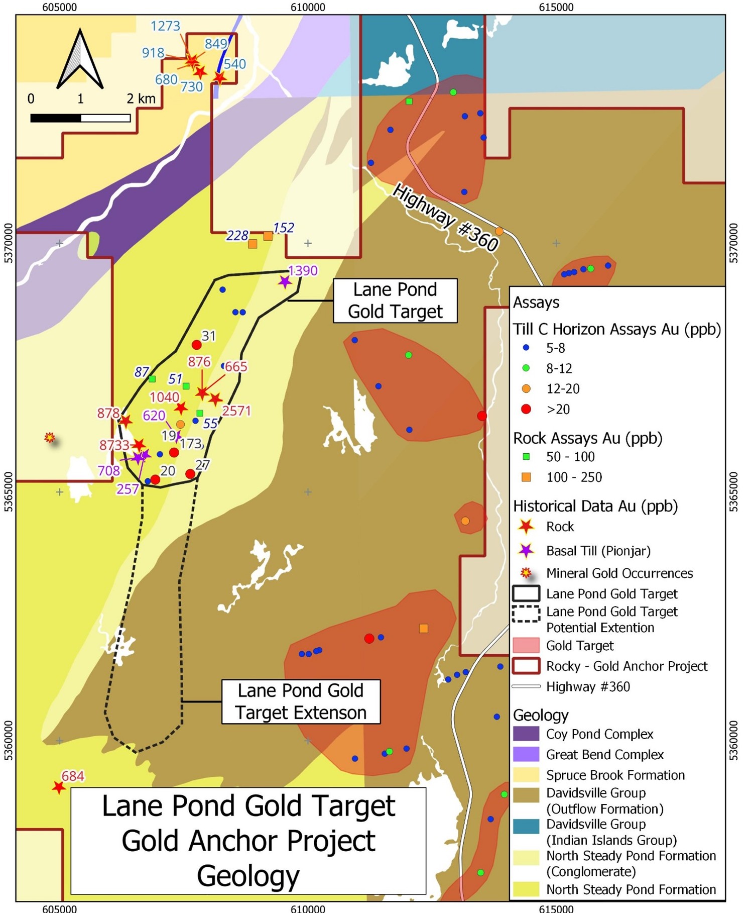 Ken Lapierre, President and Chief Executive Officer, commented, “The more we explore, the more gold potential we discover on this very strategic and exciting project. Our summer exploration program is currently underway. It consists of approximately 40 kilometres of Induced Polarization (IP), ground Magnetic and Very Low Frequency (VLF) geophysical surveys and soil and till sampling over the north extension of the Lane Pond Gold Target. Also, a till sampling and prospecting program has been initiated on the Lane Pond Gold South Extension. The geophysical anomalies associated with the Lane Pond Gold Target and its extension, combined with the recent and historical gold results in this area, make for a compelling gold target that is now more than 11 kilometres long (see Maps 2 and 3). We plan to be drill-ready this fall to test the Lane Pond Gold Target with Rocky Shore’s inaugural drill program at Gold Anchor.”