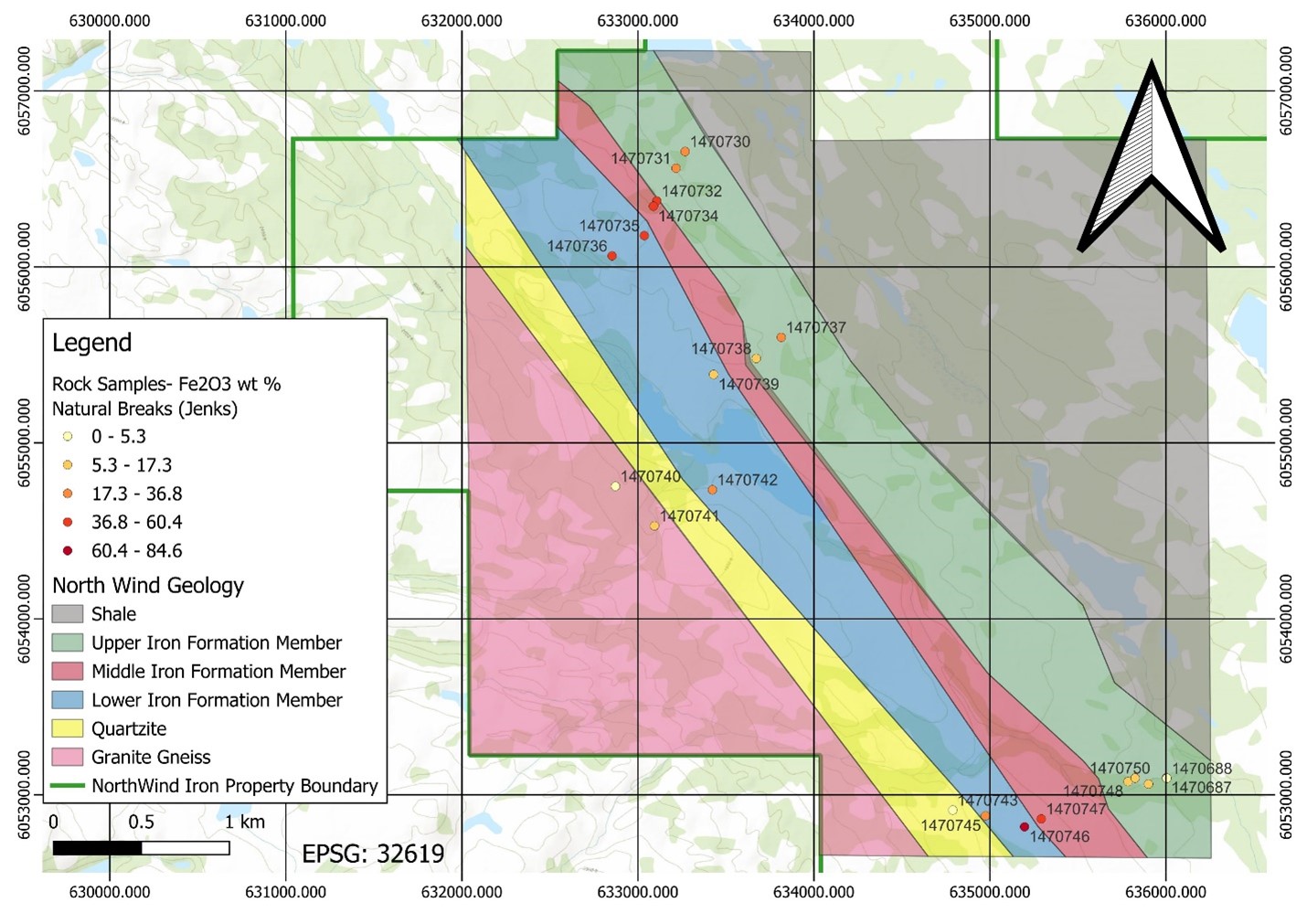 As part of routine claims maintenance, SAGA Metals conducted a comprehensive field program at the North Wind Iron Ore property in the summer of 2024. The program focused on mapping, prospecting, and rock sampling, targeting the northern and central areas of the property. The primary objective was to verify and ground truth the stratigraphic units previously sampled by New Millennium Iron. A total of 24 rock samples were collected, accompanied by key geological observations.