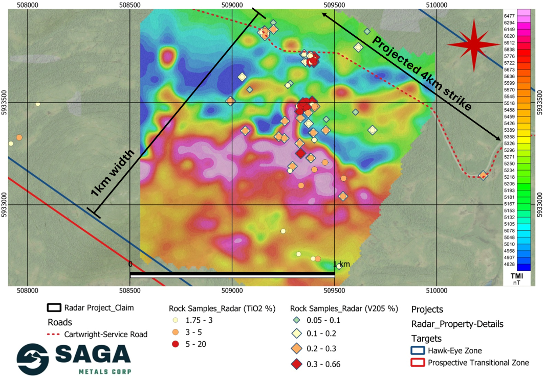 - Radar’s Hawkeye Zone Potential: Assays have returned consistent values between 2.5 – 11.1% TiO2 and 0.2 – 0.66% V2O5, confirming the presence of high-grade titanium & vanadium across a potential 1km wide and 4km long trend further confirmed with geophysics.