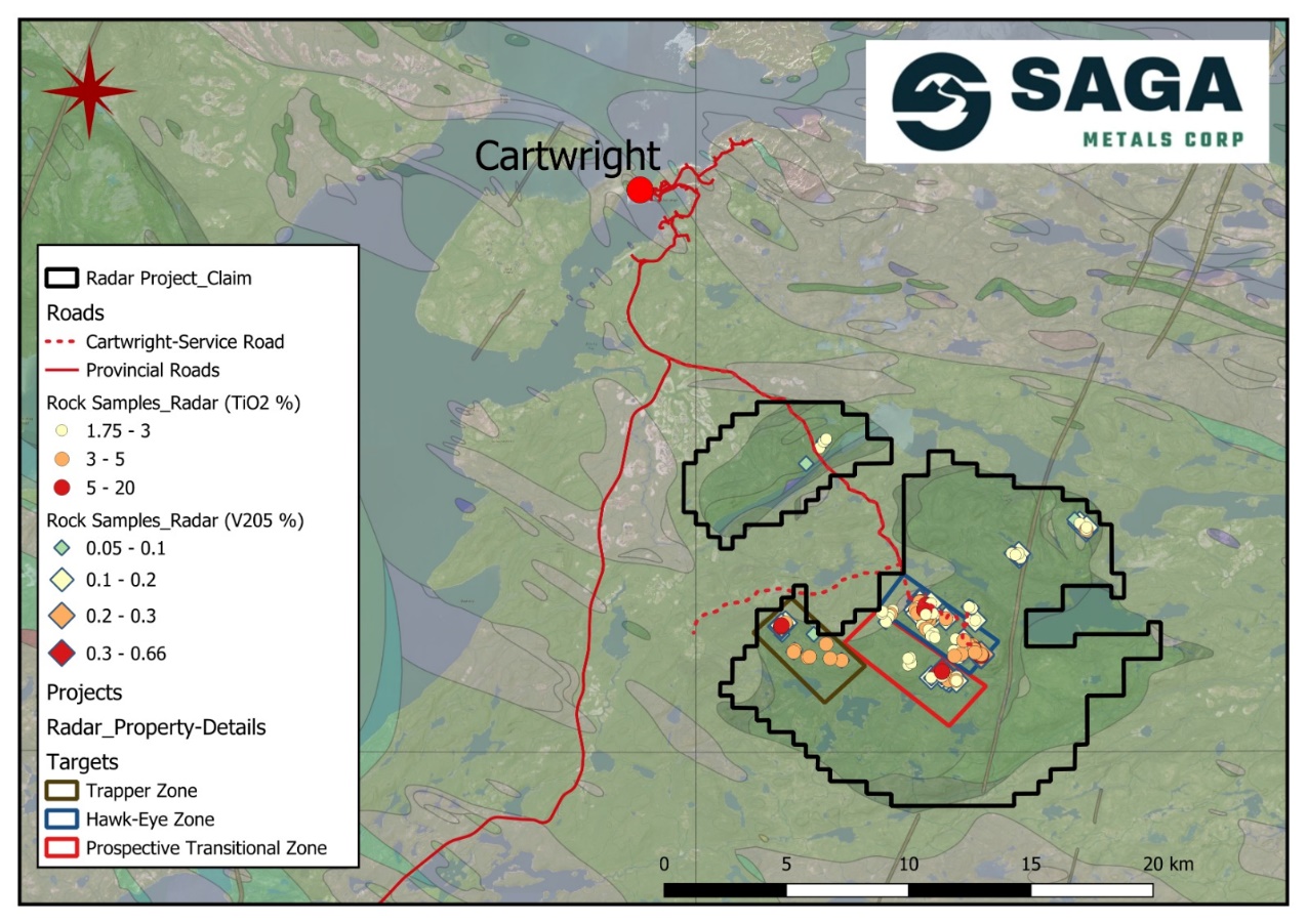 Michael Garagan, CGO & Director of SAGA Metals Corp. comments: “The decision to run back-to-back drill programs and include the Radar Ti-V project is strategic and efficient as we are always looking to maximize our cost-effectiveness and shareholder value. We’ve engaged Gladiator Drilling out of Newfoundland; mobilization to the Double Mer Uranium project brings the contractors through southeastern Labrador and past the Radar project off route 516. Both the drilling and geological teams will be able to drive right into Radar’s Hawkeye zone for an estimated 3-week drill program prior to initiating the Double Mer Uranium drill program. SAGA will be able to enter Q2 with drill results from two projects, setting the stage for a very active 2025 field season.”