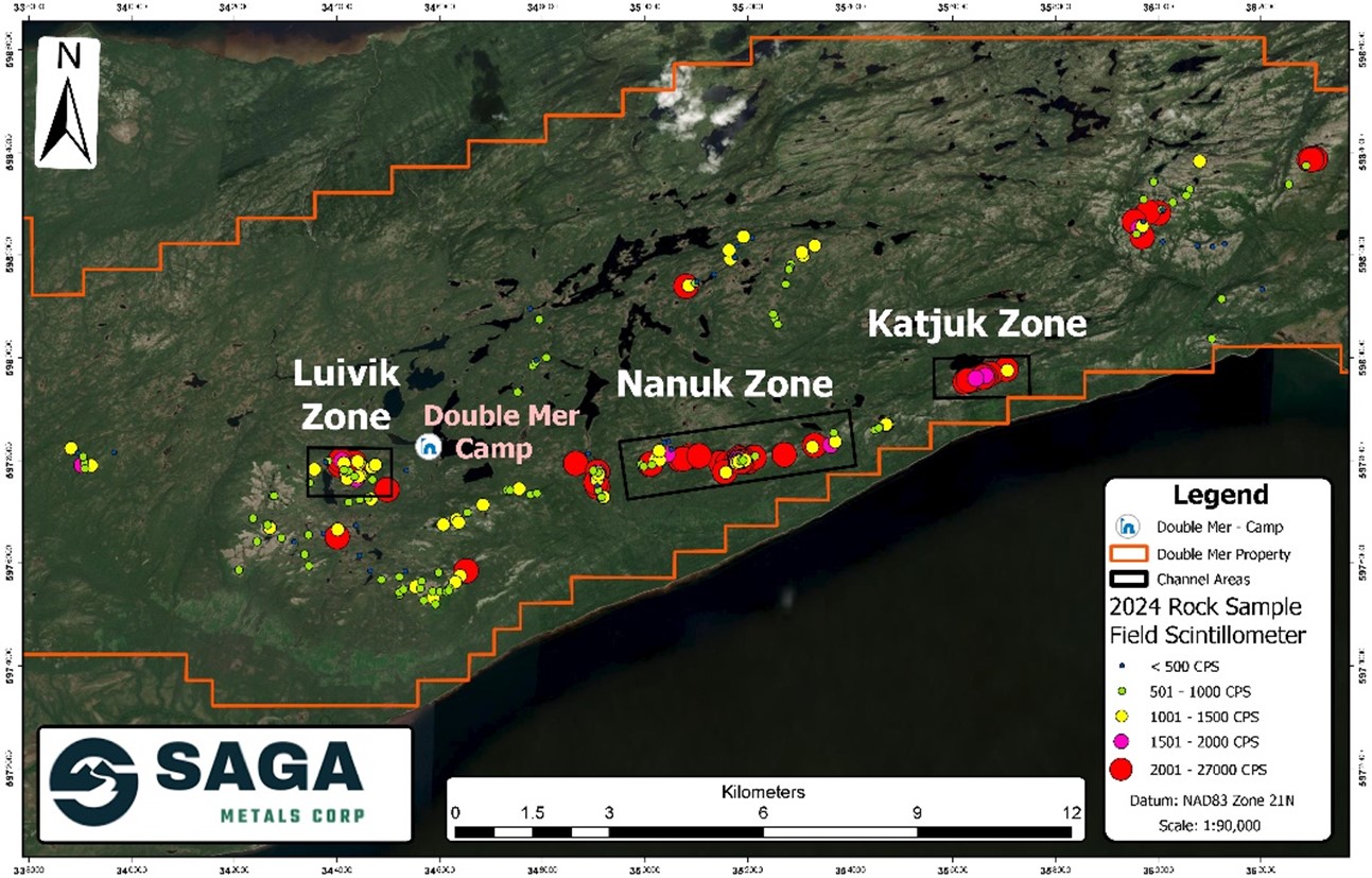 • Maiden Drill Program: SAGA’s first drilling initiative at Double Mer will focus on the Luivik zone, the westernmost area of an 18 km uranium trend identified through surface sampling and radiometric surveys. This program will assess the zone’s uranium potential, laying the groundwork for further exploration.